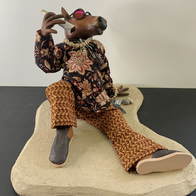 - Tête et mains façonnées en papier mâché et argile autodurcissant.